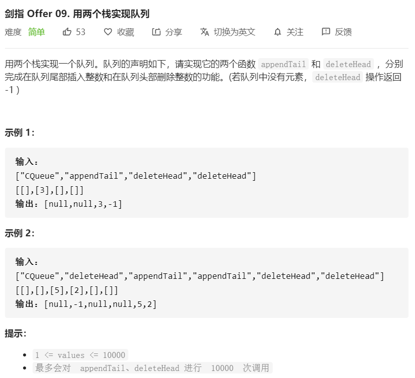 题目要求deleteHead(即出队)的时候,队列为空返回-1,我们只需要判断栈Queue是否为空即可。如果非空就直接pop()。