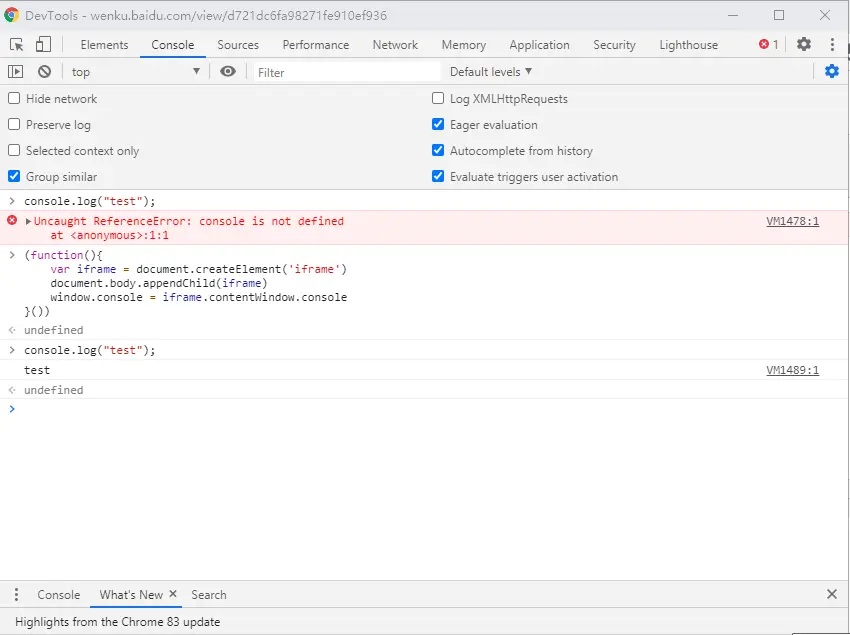 百度之后发现可以新建< iframe >元素,它会创建包含另外一个文档的内联框架(即行内框架),接着通过iframe.contentWindow获取iframe的window对象,从而获取console恢复其功能。