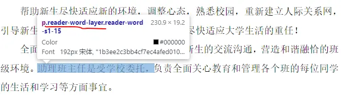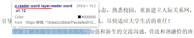 操作:先用开发者工具,点击下面的图标,然后再点击页面所需要复制的文本内容,找到他们的共同类名,如下图所示: