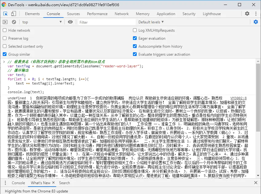 思路:为了输出想要的内容,我们要先找到所有文本,用开发者工具你会发现他们都有同个类名,也就是我们要拿到具有相同这个类名的所有dom结点。拿到dom结点之后,我们是想要dom结点里面的文本,所以其实也就是循环然后把用innerText把文本内容输出来。