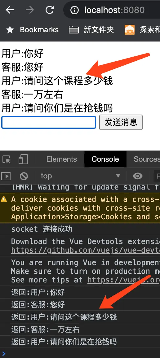 这时可以尝试再做一个后台客服的组件页面item.vue,模拟用户和客服分别在不同的电脑进行聊天的场景