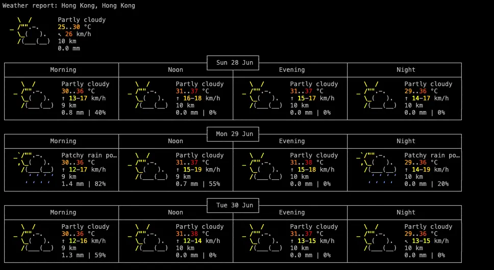 程序员查看天气的正确姿势 #HN 热帖#终端大法:wttr.in 是一个 Python 编写,可在终端查看某地天气的小工具。它使用 wego 进行可视化,并使用各种数据源获取天气预报信息。