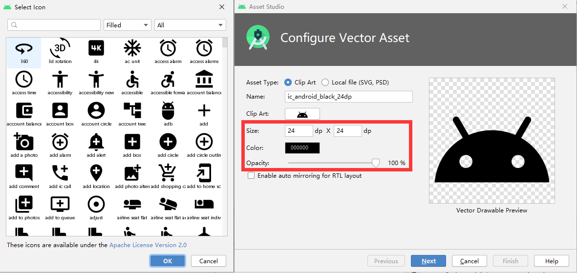 下图所示,作者使用 Android studio 4.0 版本演示,可以根据项目需求搜索 icon 图标,并且支持修改图标尺寸、颜色、透明度