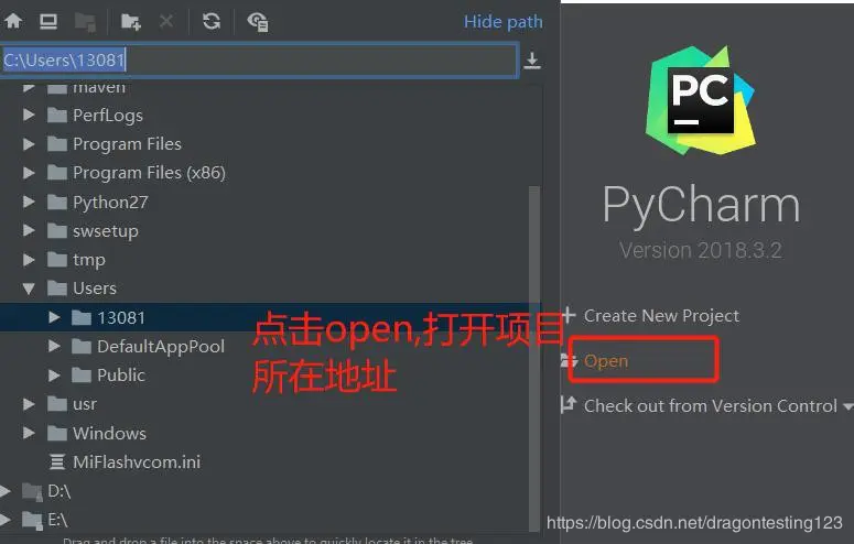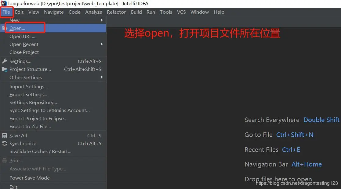 3、导入 python 项目,以 PyCharm 为例,其打开项目的方式与 intelliJ idea 一致,可以参考上面。首次打开编辑器,点击 open(此处,intelliJ idea 打开 java 编辑器也是一样的操作),如下图,然后选择项目文件所在位置的文件夹即可。