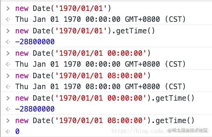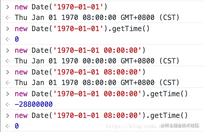 2, new Date('1970-01-01')和new Date('1970-01-01 08:00:00').getTime()结果相同,new Date('1970/01/01')和new Date('1970-01-01') ,输出结果后者多了8小时即new Date('1970-01-01')-new Date('1970/01/01') --> 28800000。