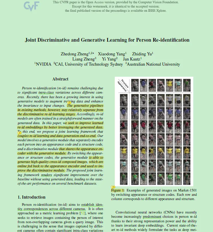 [1] Zheng Z, Yang X, Yu Z, et al. Joint discriminative and generative learning for person re-identification[C]//Proceedings of the IEEE conference on computer vision and pattern recognition. 2019: 2138-2147.