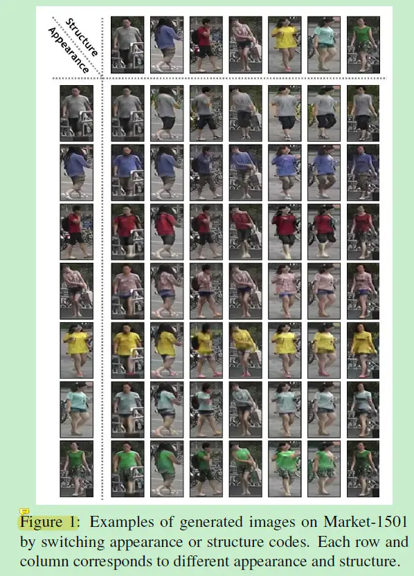 DG-Net将行人图片分解为了两种相关空间:主要用于编码外观和其他与身份相关的语义的外观空间;和包含与几何和位置相关的结构信息以及其他附加变化的结构空间。如下图1: