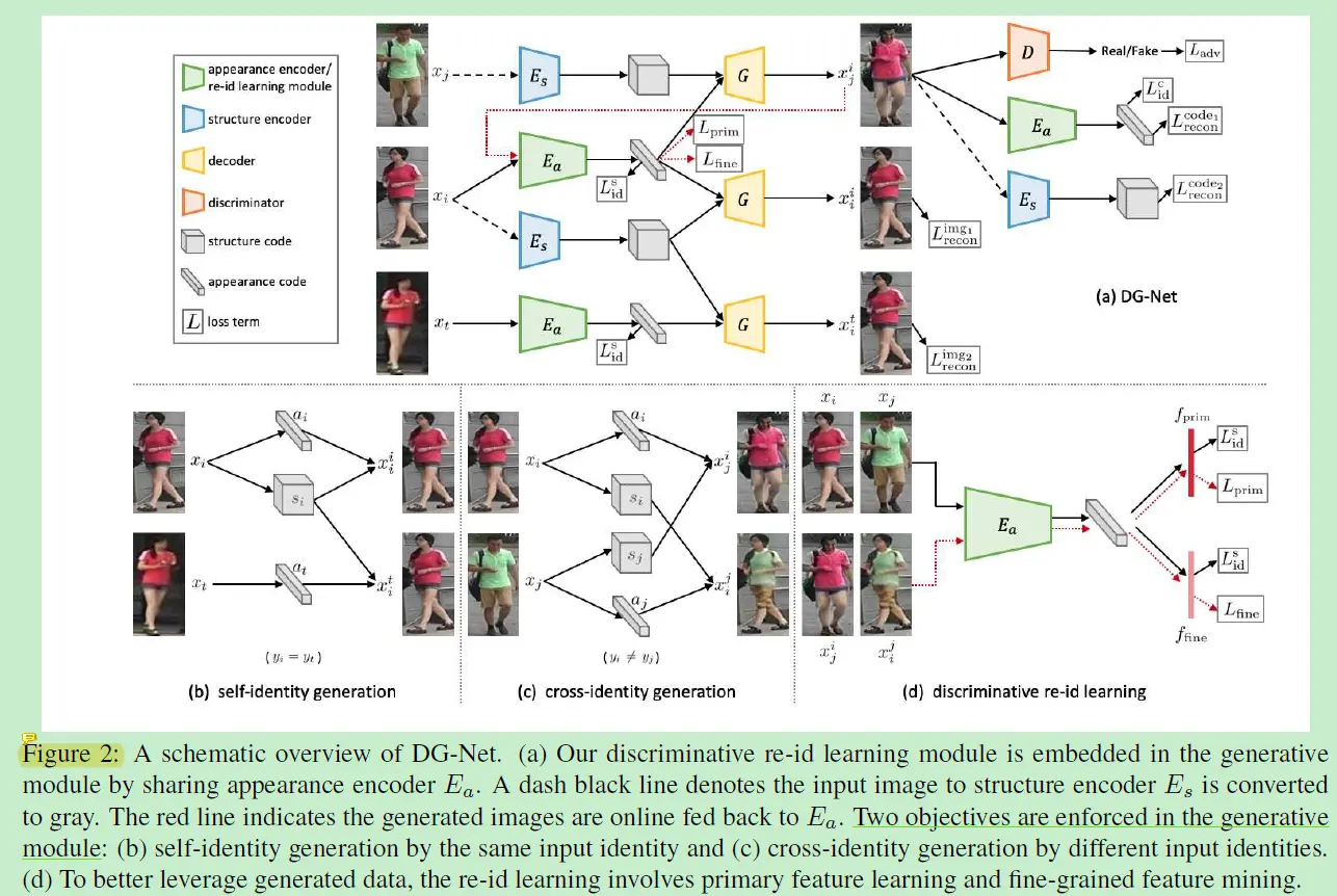 但是作者提出目前ReID使用的生成模型是一种基于GAN的独立模型,这个独立模型与辨别模型之间过于分离,作者认为受制于此,生成模型的优化目标可能会与ReID任务不够对标。因此本文提出了一种能够耦合判别与生成学习的统一网络,DG-Net。