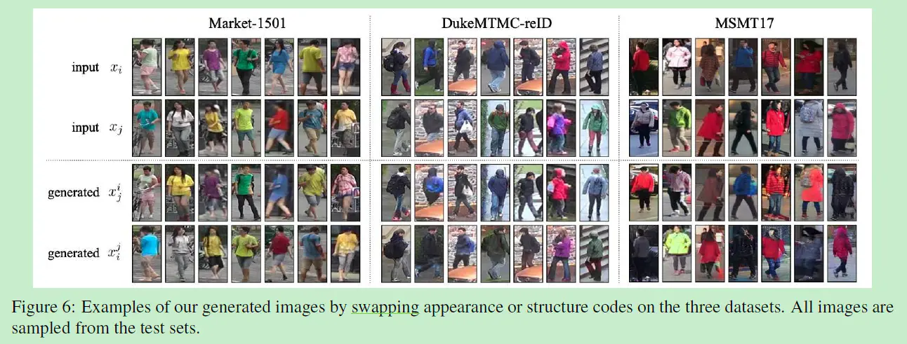 可以看到纵轴取外观(appearence),横轴取结构(structure),他们生成了7×7=49中不同的外观和结构组合结合起来的新图片。生成图像的变化都是来自训练集本身,相比于其他GAN方法,DG-Net生成的数据也更接近原始的训练集。