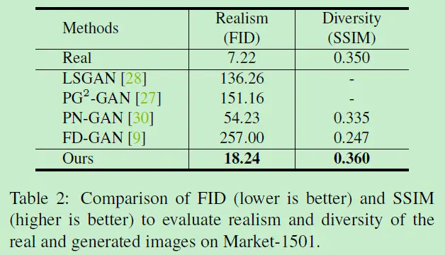 综合来看,作者认为本文提出的生成模块能够显式地基于相关编码生成高质量行人图像,而且相比于其他GAN方法能够拥有更高的可操纵性和可解释性,能够使生成图像在真实图像中受到约束,而且就产生的不同图像数量(O(N×N))而言,这样的online方法也比其他offline的GAN方法(O(2×N))具有更完备的多样性。