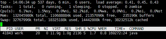 第一行是任务队列信息 top - 14:06:34 up 537 days, 6 min, 6 users, load average: 0.41, 0.45, 0.43