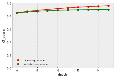 # 复杂度曲线 在全部数据集训练的情况下,随着模型参数变化,模型训练集得分和验证集得分的变化,