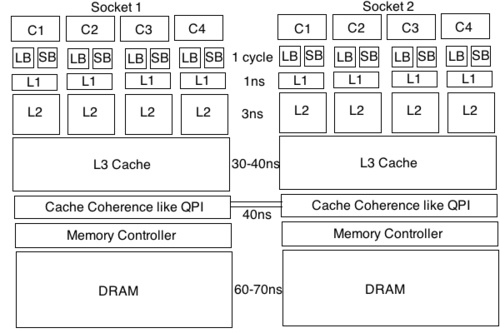 cpu对寄存器,store buffer,load buffer的访问是远远快于cache和memory的。而且在现代cpu的设计中,提升性能的主要方式就是提升并行度。而提升指令级并行的两种主要方式,包括增加流水线深度,和多发射流水线(每条流水线执行多条指令)。由于每条指令的执行时间由流水线上最耗时的阶段来决定,因此增加流水线的深度后,可以缩短每条指令的执行耗时。不过因为流水线每个阶段之间传递数据的耗时无法忽略,因此可增加的流水线的深度会存在上限。所以,另外一种方法就是让每条流水线执行多条指令。实现多发射流水线的方式包括静态多发射,和动态多发射。静态多发射可以理解为一条指令包含多个操作(VLIW[6])。动态多发射也叫超标量技术[7],一条流水线存在多个执行单元,可用于执行例如浮点计算,整型计算,store/load等。多条指令可以根据其依赖关系,实现并行执行。而且由于store/load buffer的存在,写入数据不必立马刷入内存,读取数据可以提前读取,因此可以进一步提升并行度。同时,对于分支指令,存在speculation execution(推测执行),最近爆出的cpu漏洞就是和这个技术有关。因此,从上面介绍的可知,我们的程序指令其实是乱序执行的。不过,为了保证正确性,执行后的结果却是顺序提交的,这样就防止出现分支预测失败,而导致执行了不该被执行的指令。在乱序执行的过程中,结果只会被暂存到物理寄存器和buffer中,只有当提交的时候,才会将更改写入ISA(指令级架构)寄存器和cache中。因此,当出现预测失败的时候,只要丢弃掉执行的结果就行,未提交的指令的修改不会对外暴露出来。多说一句,我们写汇编时候用到的寄存器其实是逻辑寄存器,或者说ISA寄存器,它们和真实的物理寄存器的之间存在映射关系。