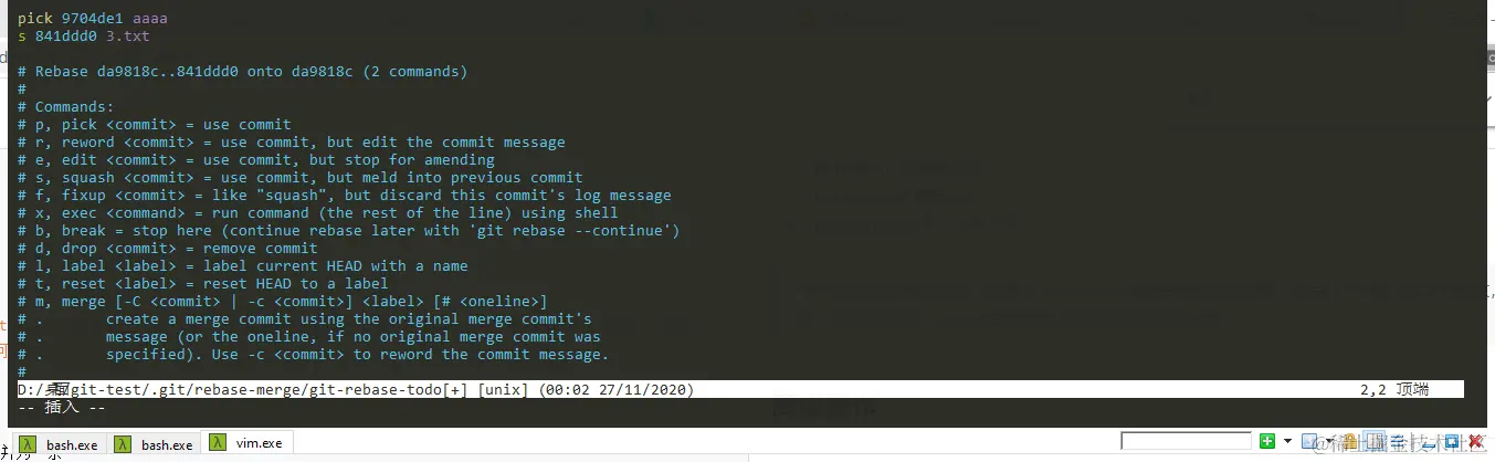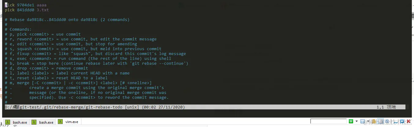 上面命令用于 rebase 过去的两条记录,执行后会出现以下编辑面板