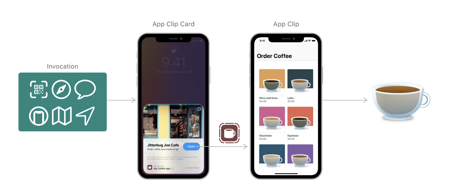首先,官方对于App Clips的大小要求是"Thinning后不超过10MB"。这个也是为了实现所谓的“Instance App”概念。 其次,App Clips的启动会先弹出Clips卡片,包含了Clips的图片信息,标题,描述,AppStore地址等信息。在此卡片的弹出后即启动下载流程,使得用户点击Open的时候看起来像是“立刻打开”。