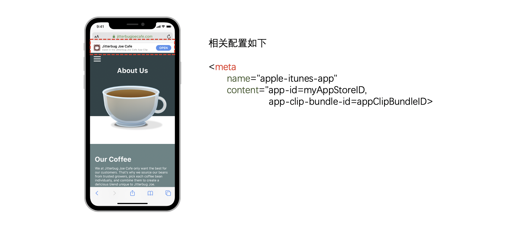WWDC内资料显示,Clips会对应一个特有的URL,通过访问对应网站JSON信息来判断是否可以打开Clips,以及解析哪些字段,来对打开的Clips做变量传递。这种交互逻辑适合于非Safari的Smart-Banner打开Clips,也称之为Default App Clip Experience。