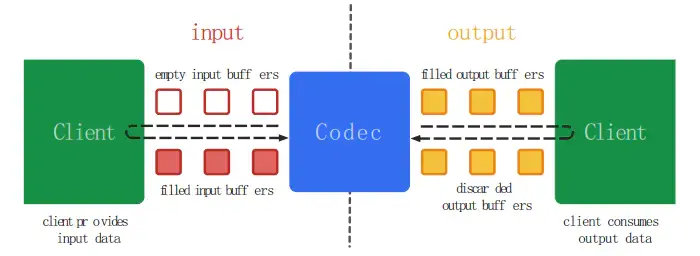 - 使用者输入端用MediaCodec请求一个一个空的ByteBuffer,填充数据后将他传递给MediaCodec去处理