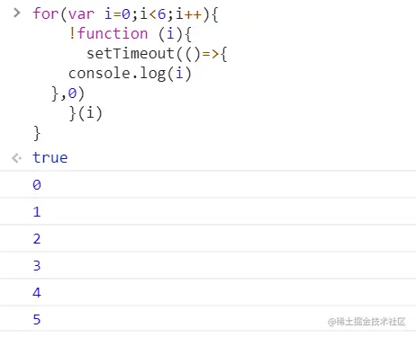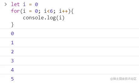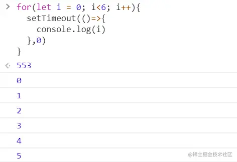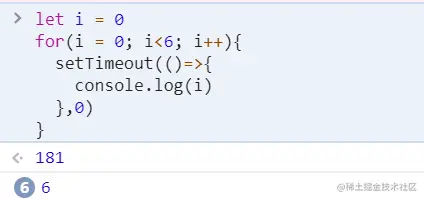 运行结果如上所示,此时即可打印出0,1,2,3,4,5。这是为什么呢?代码三中使用let声明i,此时js会自己在每次for循环之前,用let声明一个变量存储i的值,记为_i,而let声明的_i具有局部作用域,也就是说,每次循环时i的值都会被赋值给_i,会被保存在每次循环的那个局部作用域中,等for循环执行完后,过会执行六个setTimeout时,每个setTimeout打印的都是这个setTimeout所在作用域的_i,也就是0,1,2,3,4,5。而代码二中的i存在在全局作用域中,故每次循环均会改变i的值,因此最终i为6。也可以理解为代码二中只有一个全局的i,每次for循环都会改变其值,而代码三中,在每次for循环中,都定义了一个局部_i,总共六个,这六个_i互不影响。