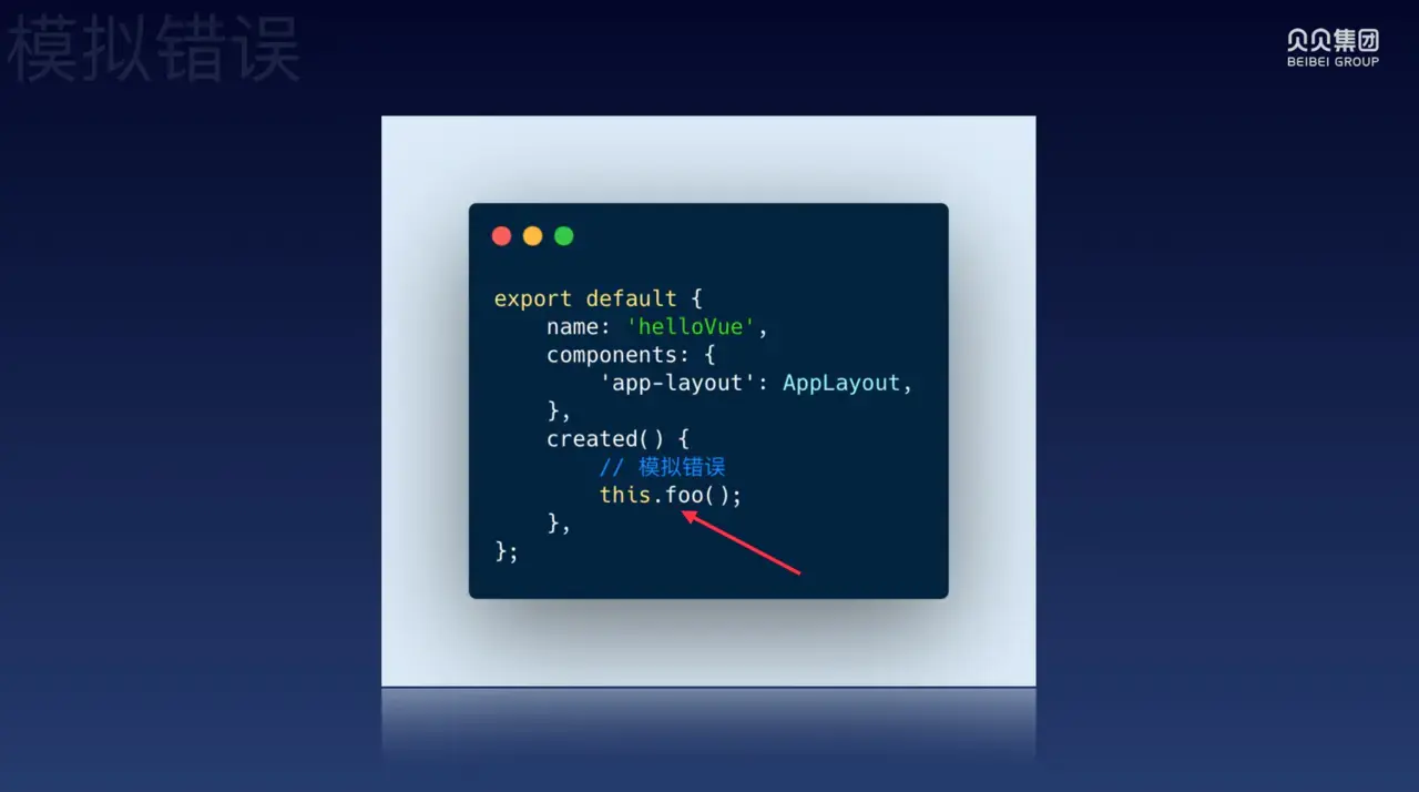 Vue 项目中有自带的错误捕获机制,Vue.config.errorHandler(errorCaptured),这里我们通过劫持Vue.config.errorHandler,当 Vue 的项目中发生错误时,将错误捕获上报。示例代码如下:
