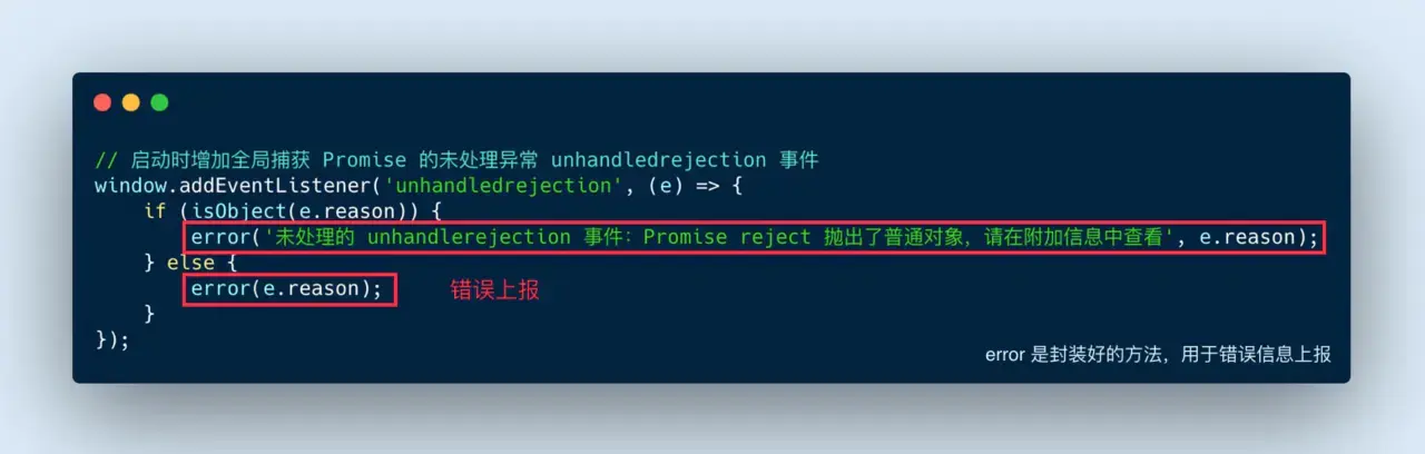当 Promise 被 reject 并且没有得到处理的时候,会触发 unhandledrejection 事件。所以可以对此事件进行监听,将错误信息捕获上报。