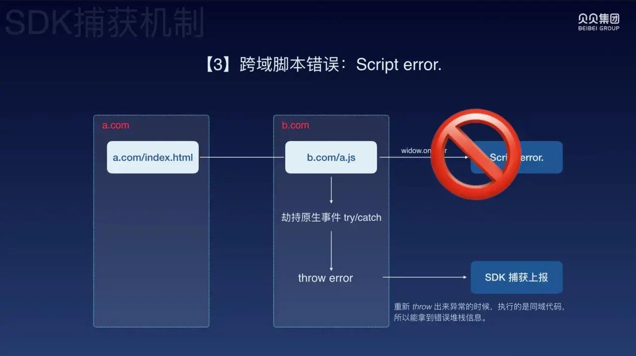 如上图所示,假如业务在 a.com 上,静态资源在 b.com 上,此时不做任何处理的时候 b 域名上的 js 报错会统一展示为:Script error.。但我们希望能获得完整的错误堆栈,所以我们采用劫持原生事件,将其进行 try/catch ,然后再抛出异常 throw error,重新抛出异常的时候执行的是同域代码,所以能拿到完整的堆栈错误信息。从而实现错误捕获上报。