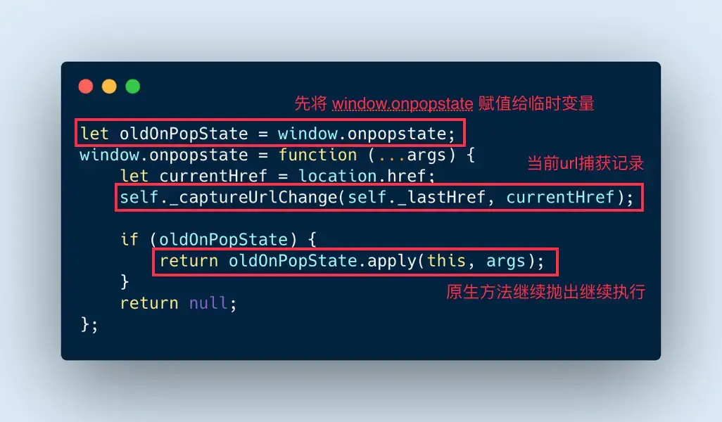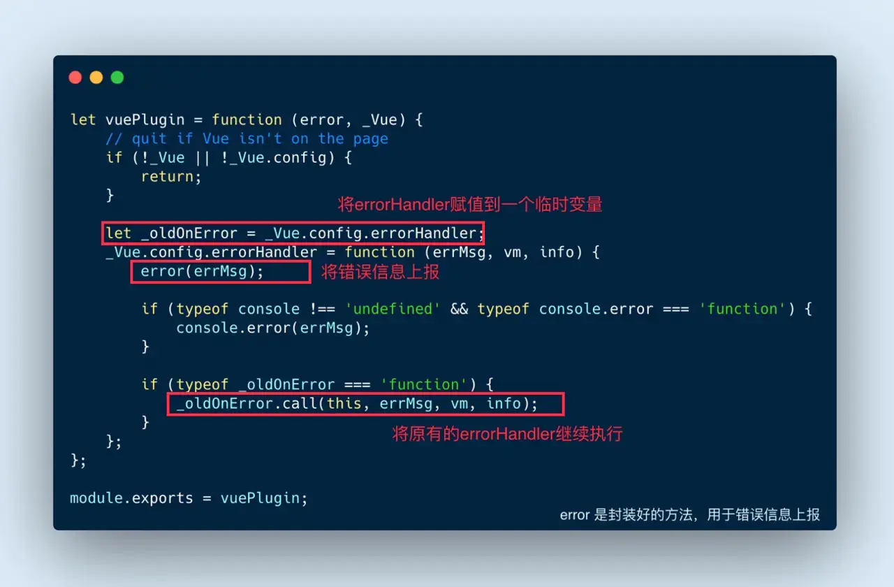 这里还是采用了 AOP 模式(不清楚的同学可以去搜索了解下)。先将原生的 Vue.config.errorHandler 方法赋给一个临时变量上,然后在错误发生的时候在里面进行上报,最后再将原有的 errorHandler 继续执行。