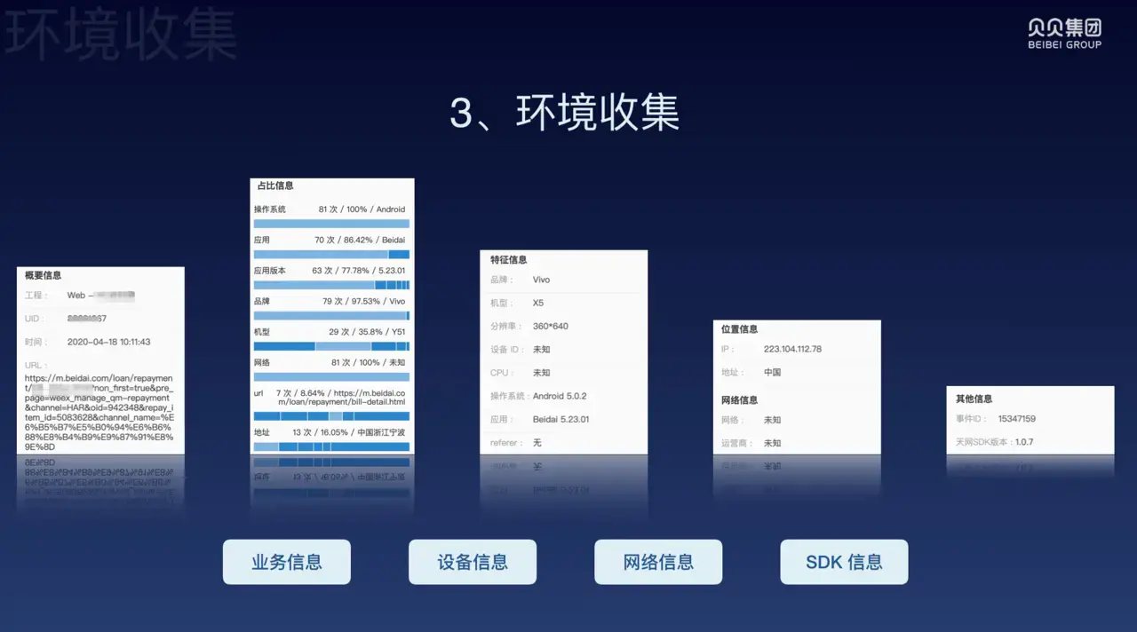 想要获得环境信息,我们先要看他是否命中主动上报,如果有,那就采用就主动上报的环境信息;如果没有,那就看是否命中 hybrid 接口(运用客户端能力捕获环境信息)的上报的环境信息,如果命中,那就采用客户端采集的环境信息;如果没有我们再去看是否命中 UA(UserAgent)收集的环境信息。这就是我们环境信息收集的 3 种方式。