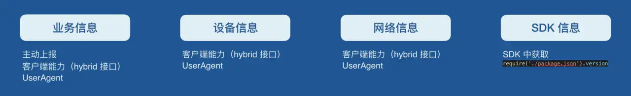 再来看之前对环境的分类,业务信息:通过主动上报、客户端能力上报和UA上报;设备信息:通过客户端能力上报和 UA 上报;网络信息:采用客户端能力上报和 UA 上报;最后 SDK 的版本信息我们直接在 SDK 中去 require('./package.json').version 这种方式获取。