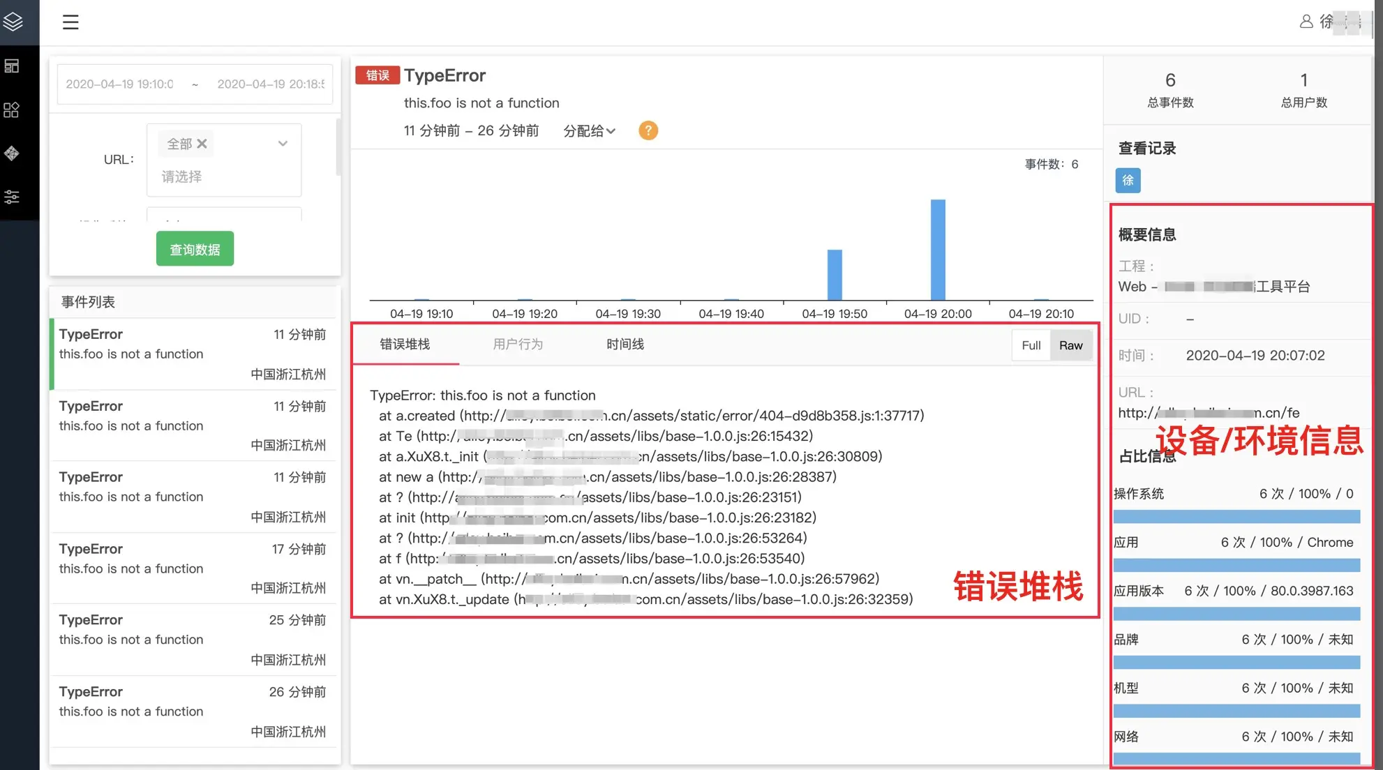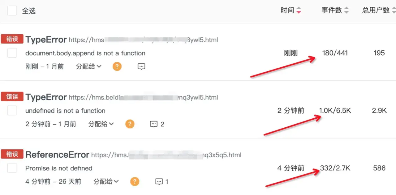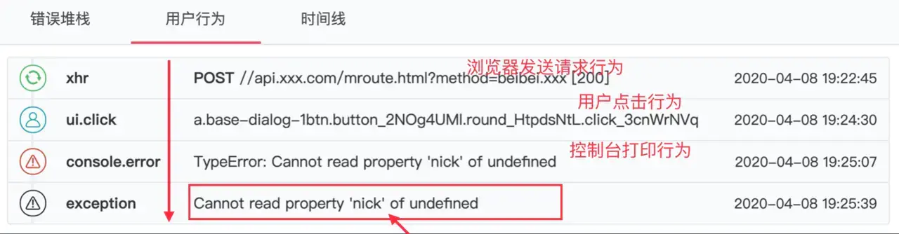 其实通过前面的错误信息和环境信息我们已经能定位到错误了,那么为什么我们还要进行行为收集呢?来看下面截图(来自我们的错误监控平台):