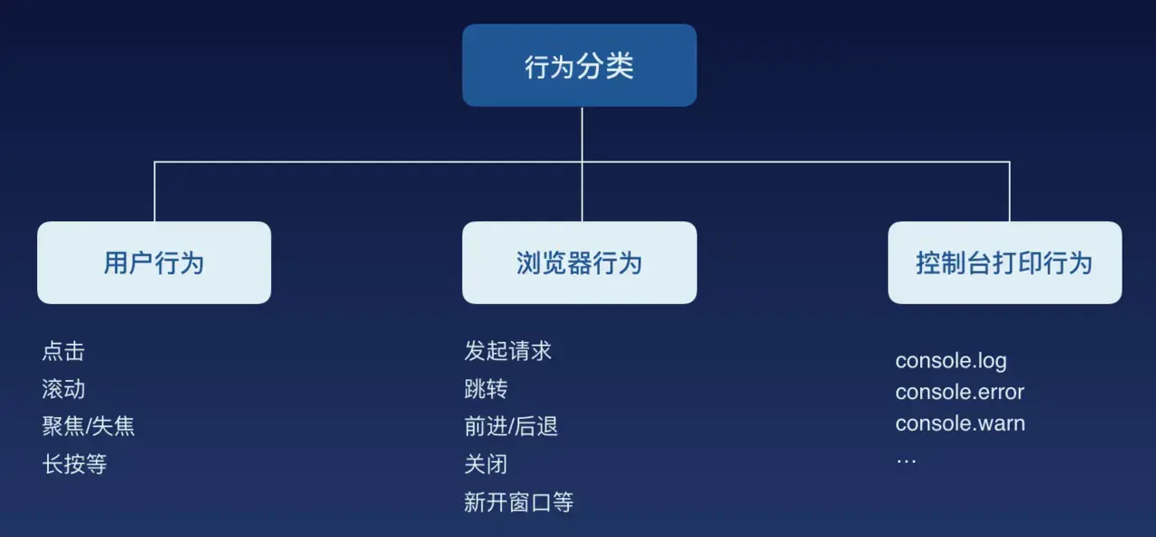 我们简单将行为分类为:用户行为、浏览器行为、控制台打印行为。