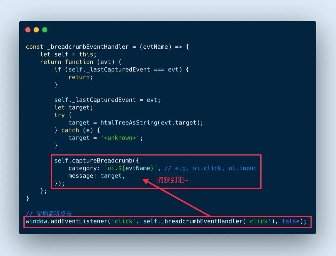 使用 addEventListener 全局监听点击事件,将用户行为(click、input)和 dom 元素名字收集。当错误发生将错误和行为一起上报。