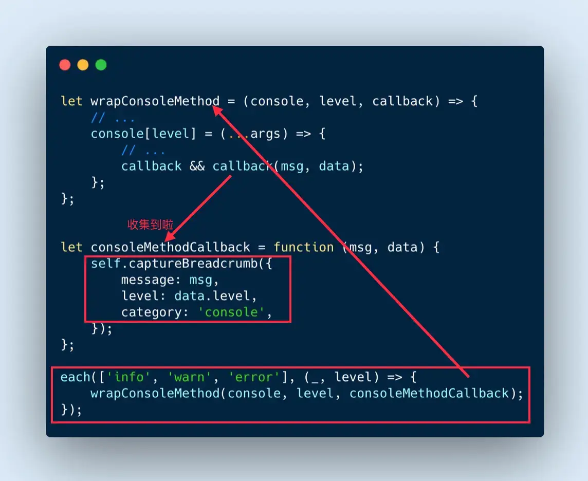 这里我们通过改写 console 对象的 **info、warn、error **方法,在 console 执行时将信息收集。
