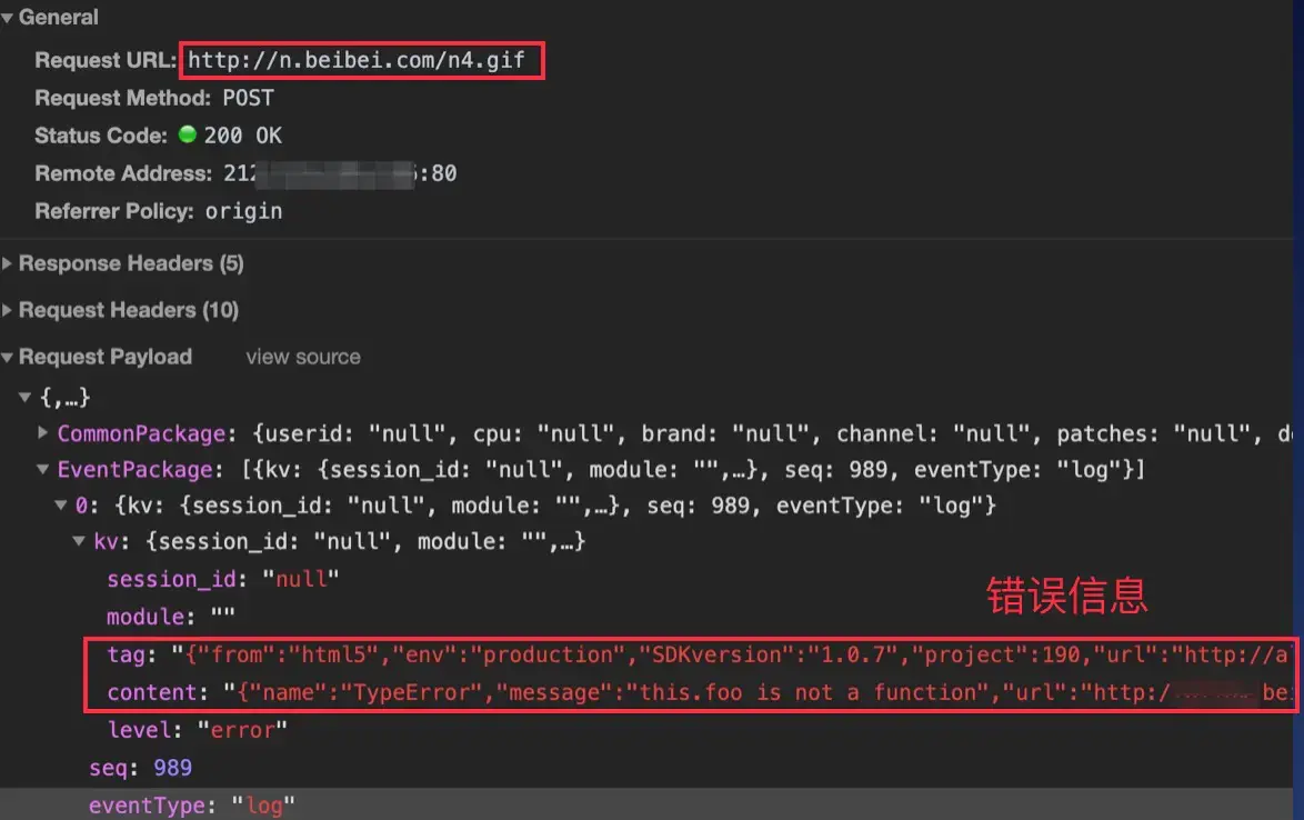 如上面截图所示,我们通过请求一个名为 n4.gif 的图片将错误信息进行上报。