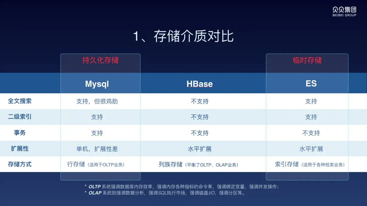 第一个是 MySQL,MySQL 大家应该比较熟悉,日常业务中都有用到。MySQL 支持二级索引、支持事务,虽然对于全文搜索不是很好,但他的使用场景其实也不太用得到全文搜索,所以他比较适合线上核心业务。