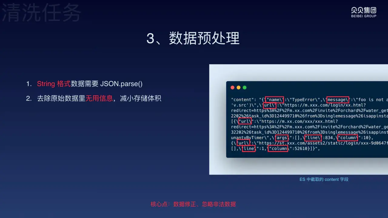 如上面ppt截图中的右图所示,这是一个从 ES 中截取的某个错误的 content 字段,由于 ES 中的 data 是 string 格式,并且代码有被转译,所以我们需要将其 JSON.parse()。并且有时候会出现里面还不完全是个字符串包裹的对象,所以我们需要将里面我们需要的字段提取出来。并且,我们还要取出原始数据中的无用信息,减小存储体积。