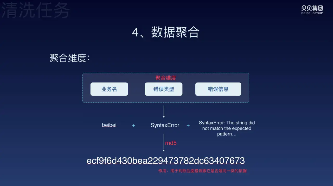 我们以贝贝业务线中的错误举例,beibei 是业务名,SyntaxError 是语法错误,SyntaxError: The string did not match the expected pattern… 是错误信息。我们将他们拼到一起,然后用 md5 得到这么一串东西:ecf9f6d430bea229473782dc63407673。