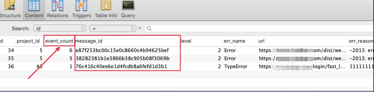 好,接下来上报的错误都会同样采用这种方式去聚合,看他们的这一串东西是否一样,如果一样,那我们就将他们识别为同一类错误,将他们在 MySQL 中存为同一条: