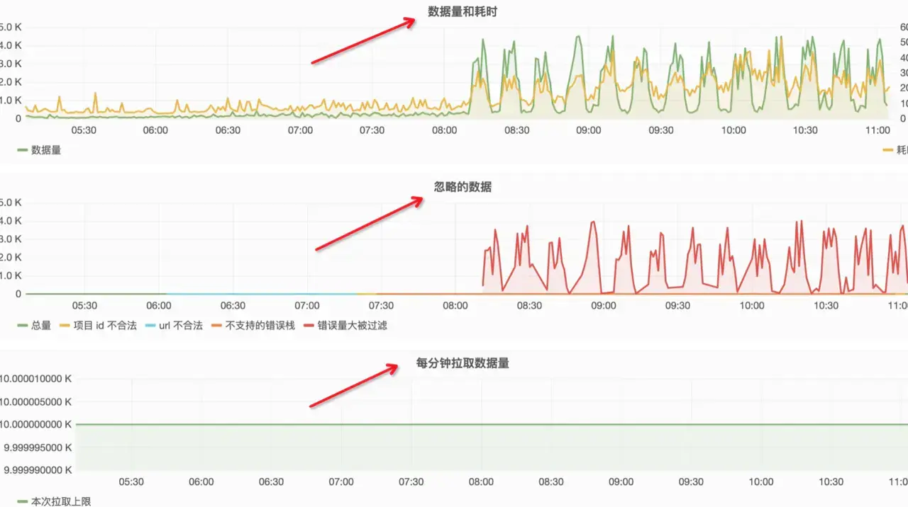 线上错误有了 SDK 进行监控,那么先看单位时间内数据量和耗时是否正常、忽略输的数据时间轴上数量是否稳定以及每分钟拉取数据量是否是 10k(之前讲过削峰价机制)