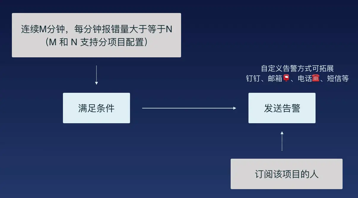 就是当某个错误满足一定条件的时候,将错误通过钉钉、邮箱、电话、短信或 webhook 等方式告诉订阅该项目的开发者。而条件我们可以通俗的理解为:某种错误,在连续 2 分钟内,每分钟报错量大于等于 100 条的时候就触发告警。然后将错误信息触达到开发者!
