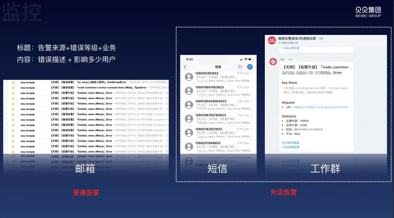 如上图所示,我们将告警分为普通告警和升级告警。升级告警中会在普通告警基础上额外增加短信和工作群,相信视频前的开发者们不管去哪里都会带着个手机,哪怕去上厕所,你们自己说是不是[斜眼笑]?然后这些告警信息上会有标题和内容。标题含有错误来源、错误等级、业务名;错误内容上会有错误描述和影响了多少用户等等。