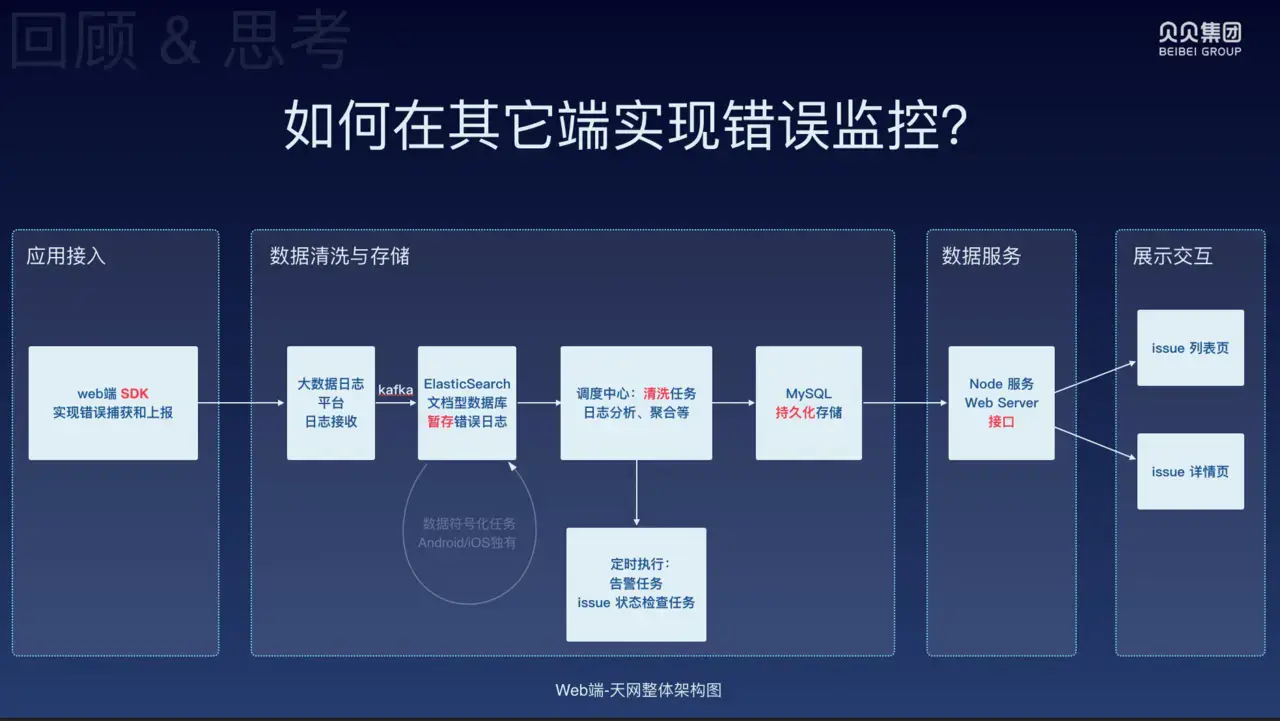 好,至此我们已经完成了 Web 端 的错误监控,实现了多端错误监控的最小闭环! 接下来思考其他端的错误监控如何实现呢?我们先来根据天网的整体架构图来回顾一下 web 端的错误监控如何实现: