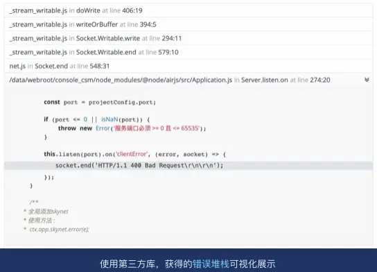 捕获到错误对象后,使用了第三方库 stack-trace 进行解析,该库会将错误堆栈解析成 数组 并获取 堆栈调用链路 中应用内文件的源码。