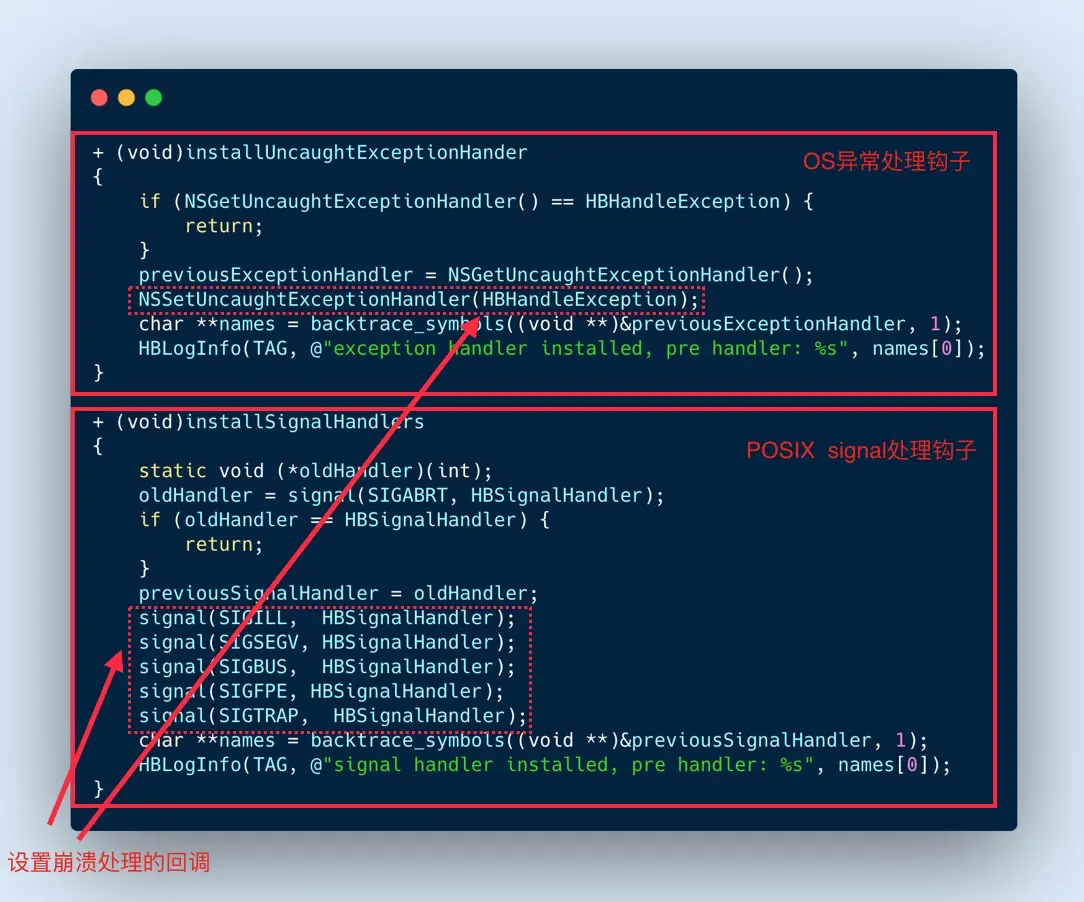 使用系统提供的错误捕获机制,注册了 Objective-C 异常和 POSIX signal 的处理钩子,在发生崩溃的时候可以通过钩子函数记录崩溃的信息。