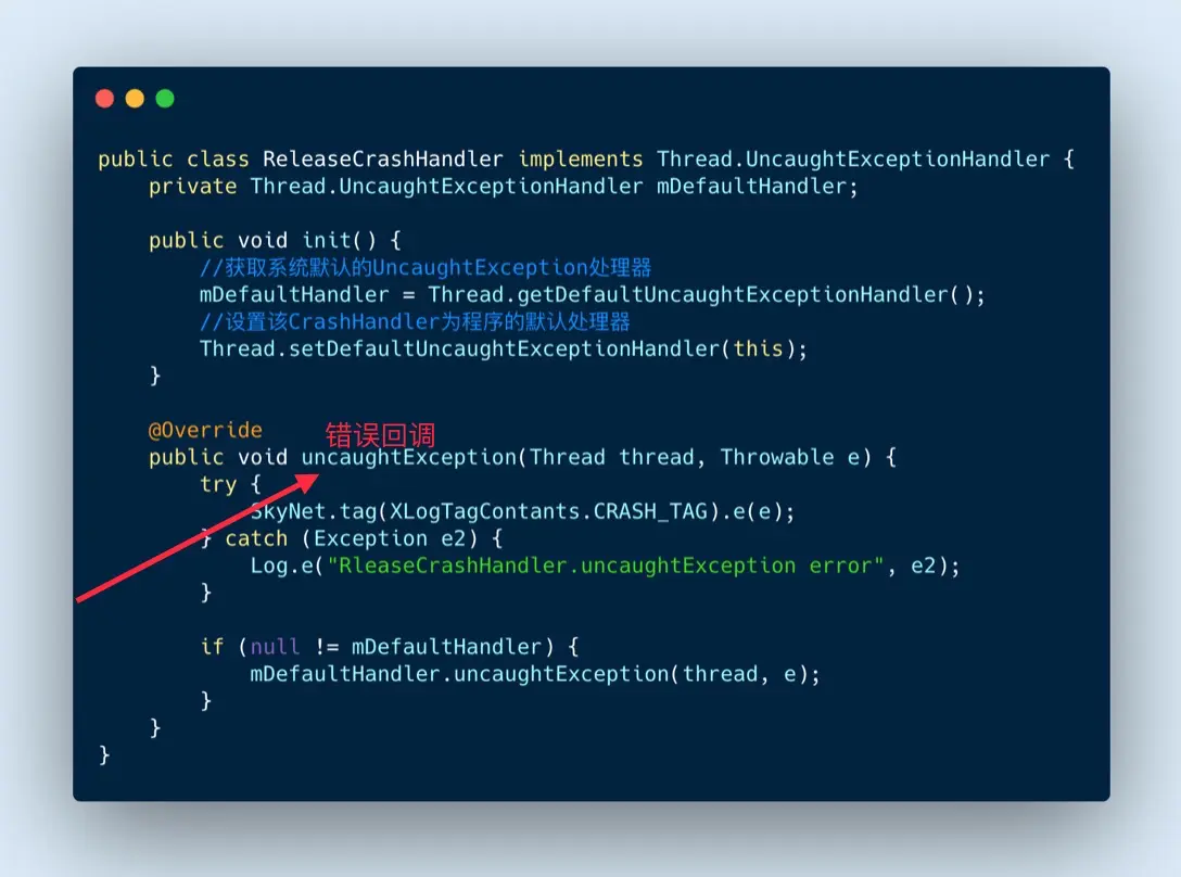 uncaughtException:可类比为前端的 window.onerror; Thread.UncaughtExceptionHandler: 回调函数。