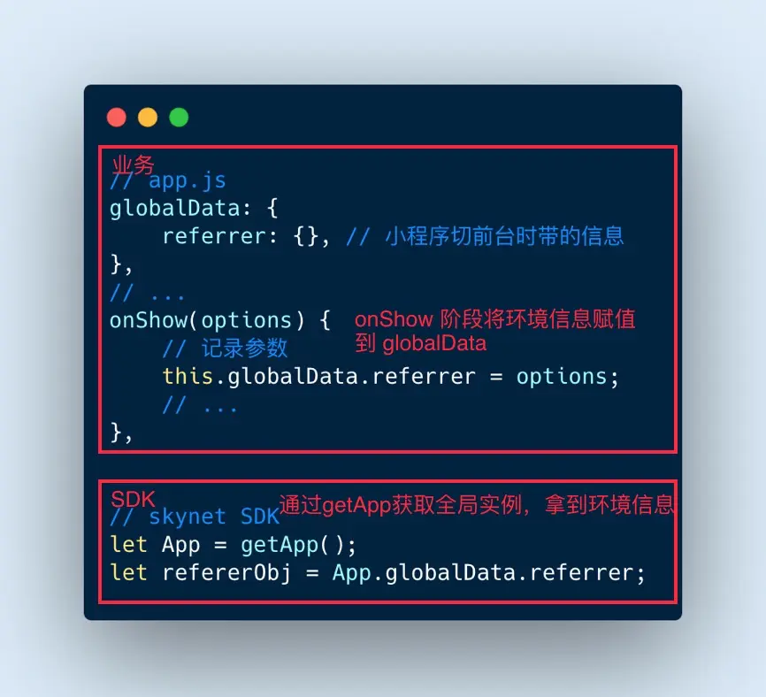 A:在小程序启动的生命周期阶段可将环境信息挂载到 globalData 上,SDK 通过 getApp 方法获取全局唯一的 App 实例,从而拿到 globalData 对象