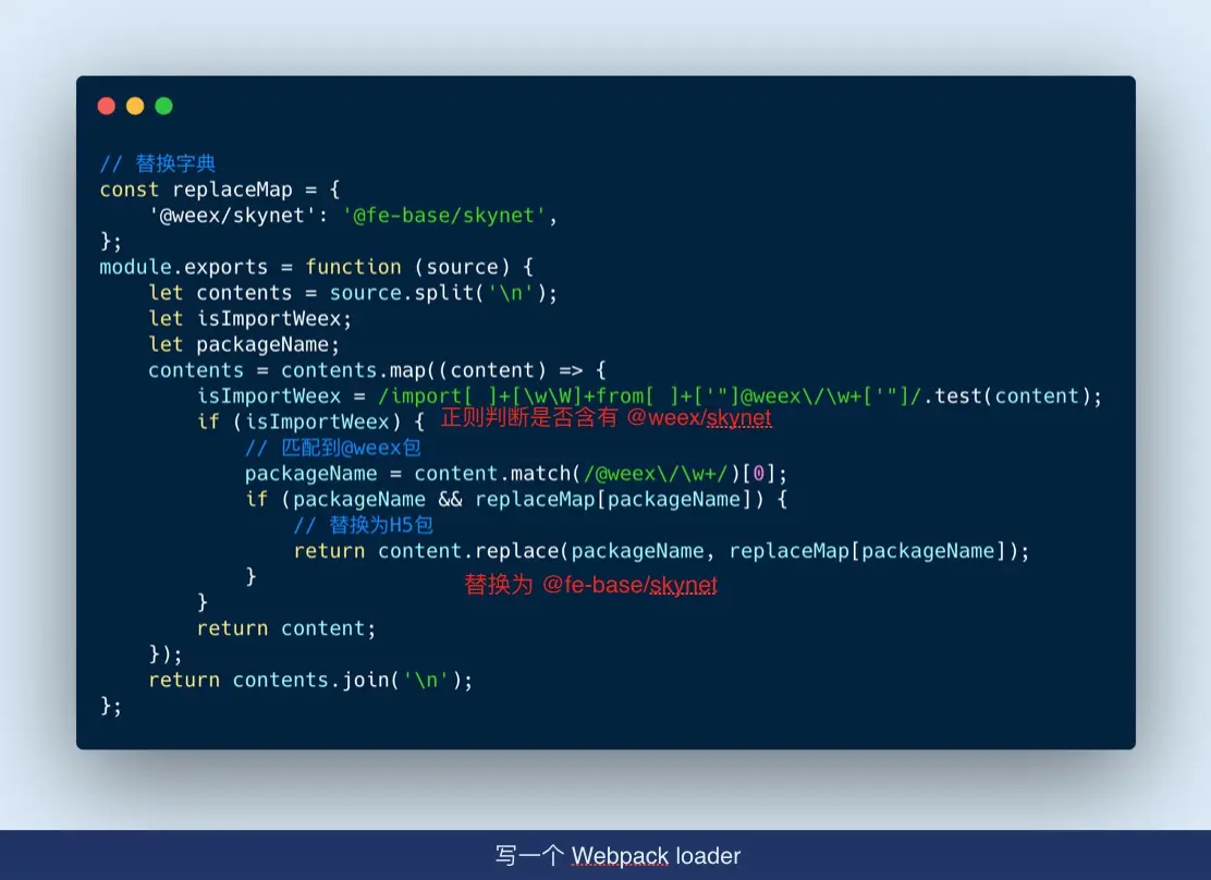 2)针对 Web 端打包的时候使用 replace-loader 这个 loader 将包替换为 @fe-base/skynet