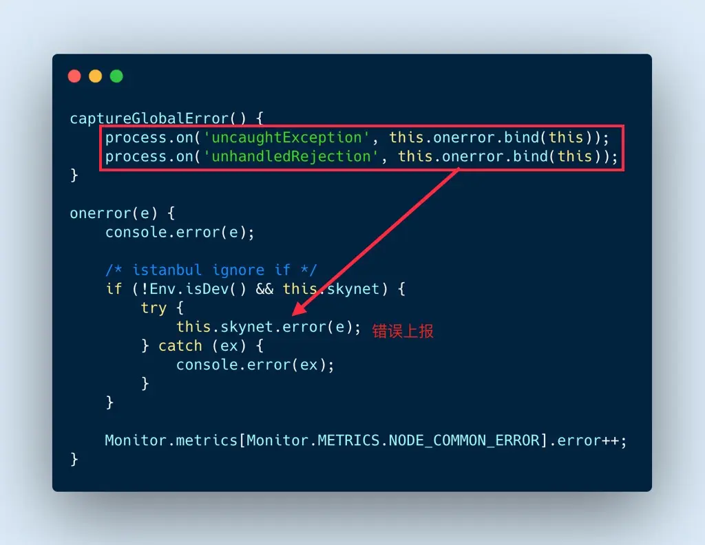 Node 端使用 process 对象监听 uncaughtException、 unhandledRejection 事件,捕获未处理的 JS 异常和 Promise 异常。