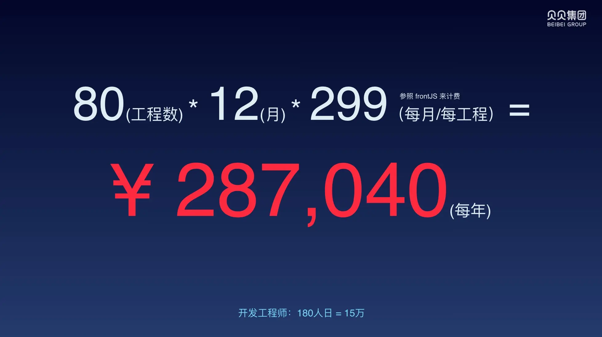 集团业务的多元发展导致现状一:业务多;行业端的分裂导致现状二:端多。而业务多和端数量的多最终导致我们集团的工程数量越来越多!据我最近统计,贝贝目前拥有线上业务超过 80 个!好,那这 80 多个业务如果采用第三方解决方案,从企业的角度来看我们需要付出多少成本呢?