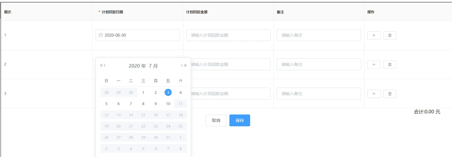 <el-date-picker v-model="scope.row.planTime" type="date" placeholder="请选择计划回款日期" format="yyyy-MM-dd" value-format="yyyy-MM-dd" :editable="false" :clearable="false" @focus="changeDate(scope.row.planTime,scope.$index)" :picker-options="pickerOptions" />