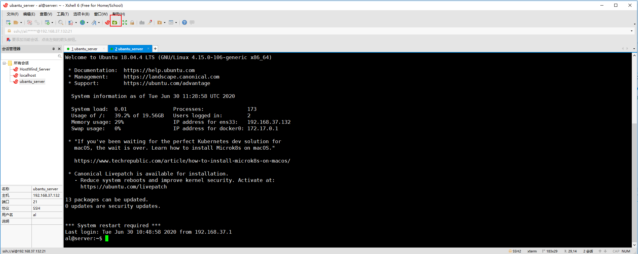 解决FTP无法登陆 熬夜变成瓜皮 2020-06-30 267 阅读1分钟 今天要给服务器传几个文件,下了个XFTP居然连接不上。显示连接中,然后超时失败。 试了半天,又是看配置文件,又是改SSH端口重启,都不管用。 后来灵机一动,从Xshell的入口进入。居然成功了。。。 怀疑是登陆验证的问题